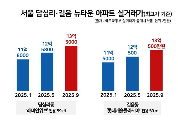 이 단지 대각선에 위치한 답십리동 ‘래미안위브’ 전용 59㎡는 8월까지 12억원대에 거래됐으나, 지난 9월 들어서만 13억원대 거래가 3건 발생했다. 13억5000만원(12층) 신고가도 나왔다. 선호도가 낮은 저층을 제외하면 입주 가능한 매매 매물은 14억원부터 나와 있다.