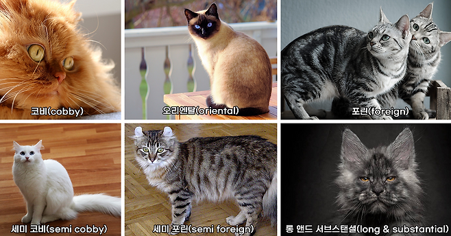 - 세미 코비(semi cobby) : 오리엔탈과 코비 중간형으로, 다리가 짧고 몸통이 조금 긴 편이에요.
