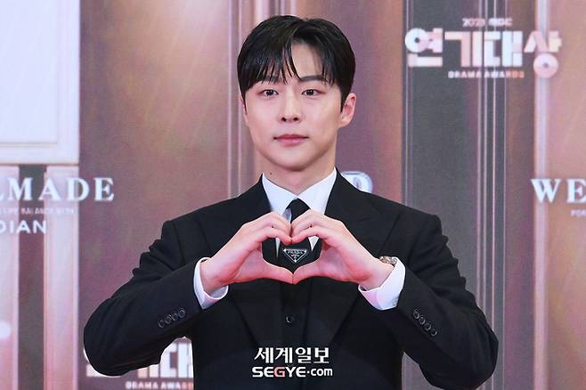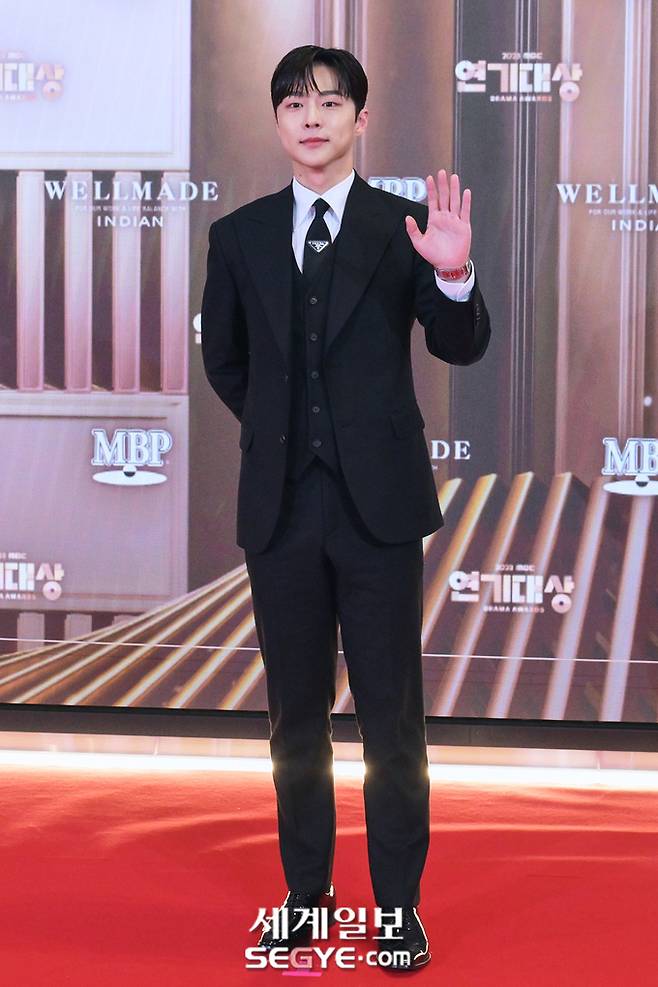 배우 배인혁이 30일 오후 서울 마포구 상암동 MBC 사옥에서 진행된 '2023 MBC 연기대상' 레드카펫 행사에 참석해 포즈를 취하고 있다.