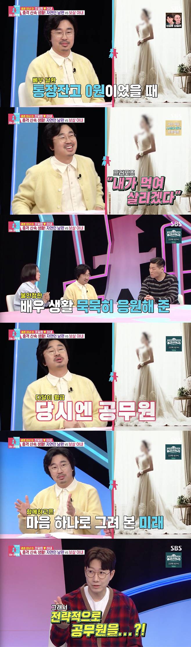 SBS ‘동상이몽2’에서 그는 “아내가 공무원이었고, 20평짜리 공무원 아파트에서 아이 하나 낳고 살면 충분하다고 하더라”며 “내가 먹여 살릴 테니 결혼하자고 먼저 말해줬다”고 고백했다.