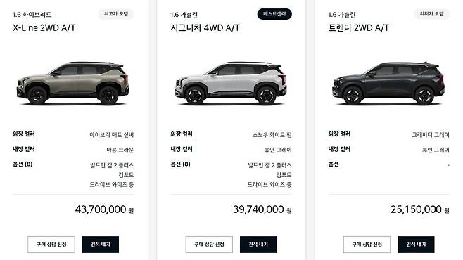 신형 셀토스는 트렌디–프레스티지–시그니처–X-라인의 4단계 트림으로 운영되며, 1.6L 터보 가솔린과 1.6L 하이브리드 선택에 따라 가격이 달라진다.