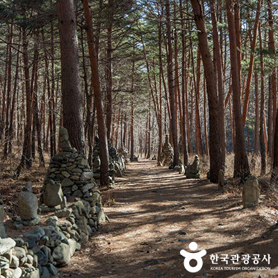 노추산을 감싸고 흐르는 송천을 건너면 폭신한 솔잎이 깔린 모정탑길이 시작된다. 산책로의 길이는 약 1.2km로, 경사가 완만하여 누구나 편하게 걸을 수 있다. 울창한 소나무들이 길을 따라 나란히 서서 길을 안내한다. 30분 정도 걷다 보면 어른 키만 한 돌탑들이 늘어선 모습을 보게 된다. 이곳에서 만나는 모든 돌탑이 차 할머니의 손끝에서 만들어진 것임을 알게 된 순간, 경이로움이 밀려온다. 알고 있었던 이야기지만, 이렇게 방대한 수의 돌탑을 마주하니, 그 어머니의 사랑이 고스란히 느껴진다. 또한 인간이 가진 힘과 의지를 다시금 깨닫게 되는 순간이다. 차 할머니가 돌탑을 쌓으며 지내던 움막집도 있으니 함께 찾아보자.