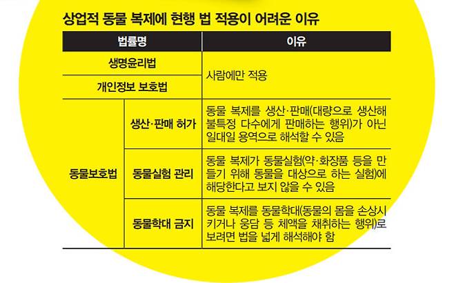 조찬형 반려동물 전문 변호사는 1월 10일 전화 통화에서 "현재로선 상업적 동물 복제를 규제할 법적 근거가 없다"며 "‘생명윤리법'과 '개인정보 보호법'은 모두 사람에 한해 적용되는 법이고 동물보호법 내 동물 생산·판매 허가, 동물실험 관리, 동물학대 금지 등 조항을 적용하려 해도 복제는 각 조항의 개념 정의와 맞아떨어지지 않는 부분이 있다"고 설명했다(표 참조). 조 변호사는 "상업적 동물 복제를 어디까지 허용하고 어디부터 규제할지 법체계를 만들기 위한 논의를 시작해야 할 시점"이라고 말했다.