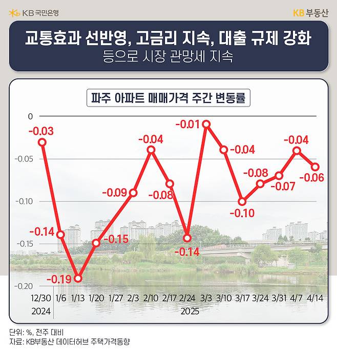 KB부동산 데이터허브 주택가격동향조사에 따르면, 경기도 파주 아파트 가격은 개통 후 15주 동안(2024년 12월 30일~2025년 4월 14일) -1.25% 하락했습니다. 같은 기간 전국 아파트 가격이 -0.29%밖에 하락하지 않았던 것과 비교하면 현재 파주 부동산시장은 GTX 개통 효과를 보고 있지 못하는 모습입니다.