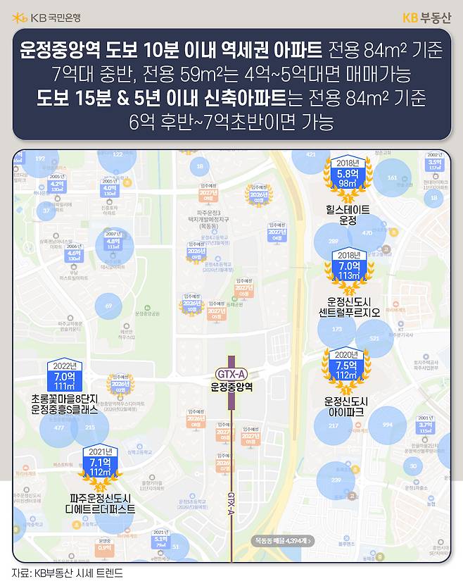 보도 15분 거리로 확대하면 입주 5년차 이내의 신축아파트를 고를 수 있습니다. ‘파주운정신도시 디에트르더퍼스트’는 2021년 입주한 5년차 아파트로 운정중앙역과 도보로 15분 정도 걸리는 단지인데요. KB시세에 따르면, 현재 이 단지 전용 84.99m²의 KB시세 일반가는 7억1000만원 수준입니다. 비슷한 입지의 입주 4년차 ‘초롱꽃8단지 중흥S-클래스’ 전용 84.15m²은 현재 시세가 6억9500만원으로 형성돼 있습니다.