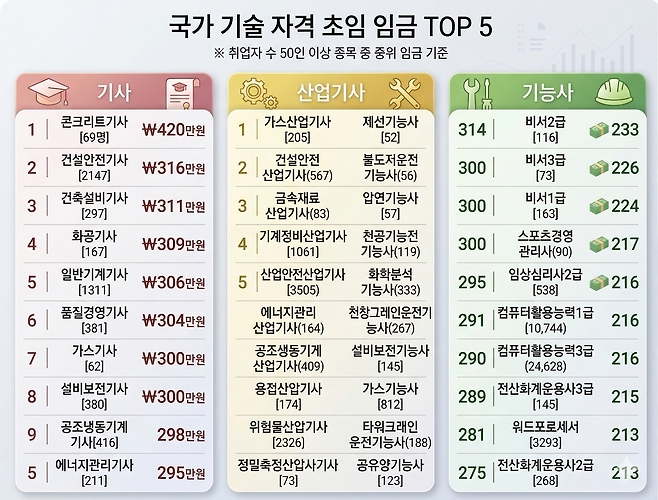 이는 자격증 등급보다 해당 직무 분야의 인력 희소성이 임금에 더 큰 영향을 미친다는 사실을 증명합니다. 가스산업기사와 건설안전기사 역시 안전 관리 강화 정책에 힘입어 315~316만 원 수준의 높은 초임을 형성하고 있습니다.