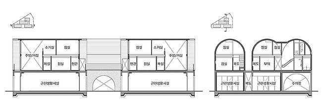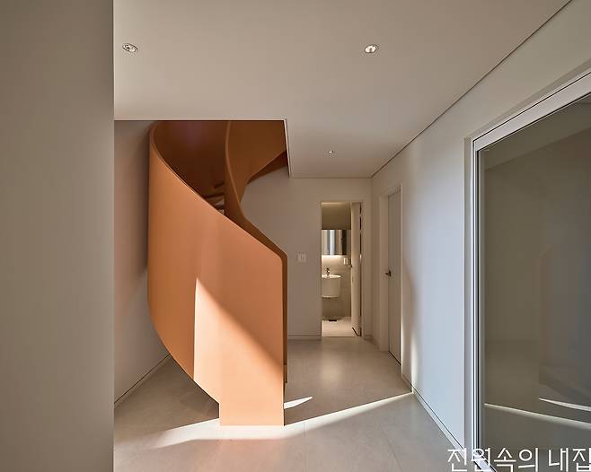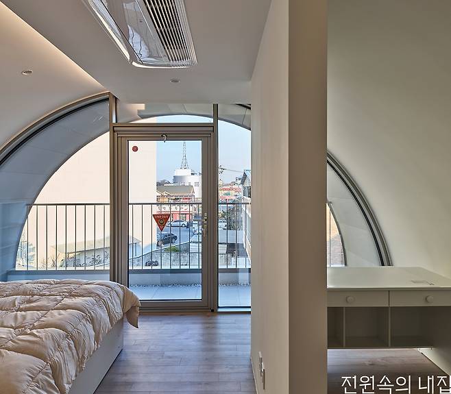 건축을 계획하기 전, 세모난 부지에는 포장마차 형식의 식당이 운영 중이었고, 건축주 가족은 부지 바로 옆에 위치한 주택에서 부모님 세대와 함께 살고 있었다. 13년을 살았던 집에서 가족이 독립을 결심하게 된 가장 큰 이유는 두 딸에게 각자의 방을 만들어주고 싶었기 때문이었다. 3층 두 딸의 방 역시 반원형의 지붕이 감성적이고 창의적인 분위기의 공간을 형성한다.