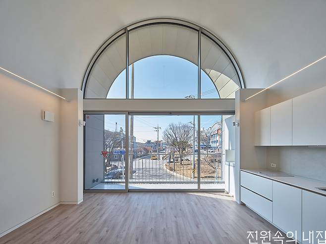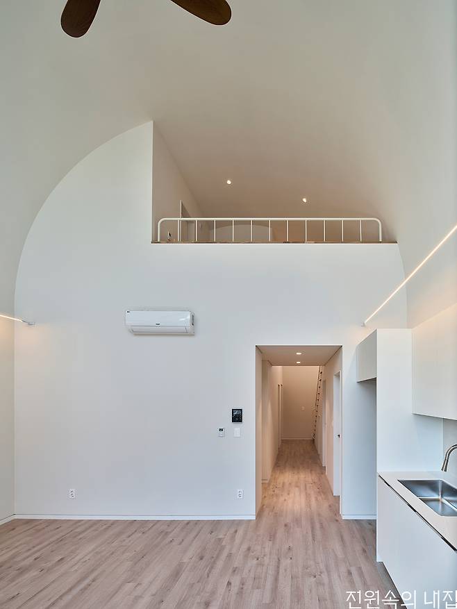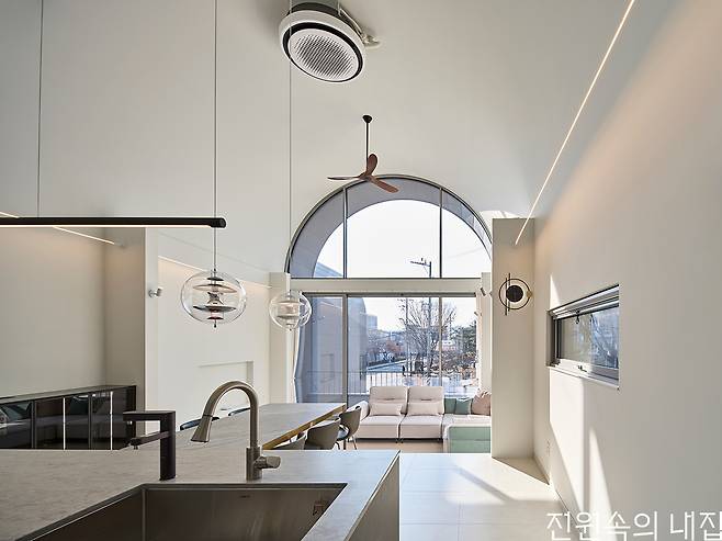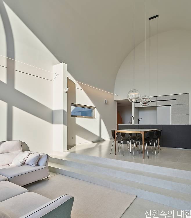 건축주가 그다음으로 바랐던 것은 개방감이었다. 부부는 집 안에 들어왔을 때 가슴을 시원하게 열어줄 트인 공간을 원했다. 거실은 아치형 천장까지 6m가 넘는 층고를 지녔다. 거실에서 이어지는 전면부는 아치를 살린 거대한 창으로 구성되어 극적인 개방감을 형성한다. 여기에 실내 구조도 최대한 단순하고 명료하게 펼쳐지도록 만들었다.