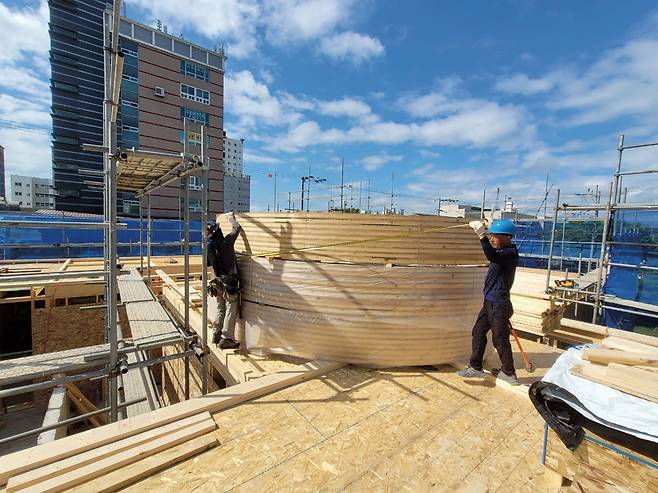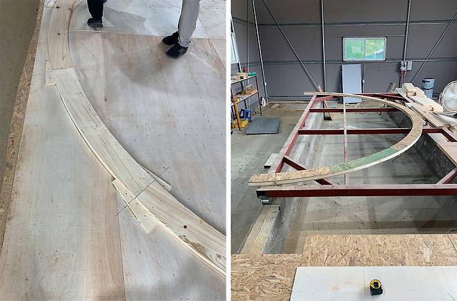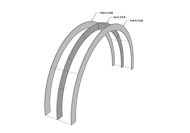 지붕 서까래의 단면은 2×10이지만, 곡선의 형태를 연출하기 위해 2×12 부재를 사선으로 재단하며 구조물을 제작했다. 재단된 곡선 부재는 한 번 더 OSB 합판으로 엇갈려 보강 작업을 더했다. 공장에서 제작된 곡선 지붕재를 현장에서 고정하기 위해 하부에는 6각 피스를 사용하여 목구조 부재와 결합하였다.