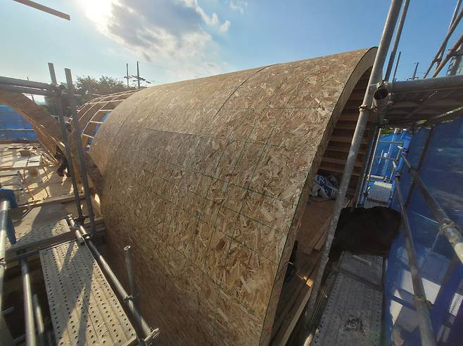 투닷건축사사무소는 곡선이면서도 얇은 지붕 선을 구현해 내기 위해 지붕을 목구조로 택했다. 1층은 철근콘크리트 구조이고 2, 3층은 목구조인 하이브리드 주택이다. 공장에서 반원의 서까래를 제작해 현장으로 운반 후 설치가 이루어졌다. 날렵한 지붕 선과 들여진 창은 곡선을 한층 돋보이게 강조한다.