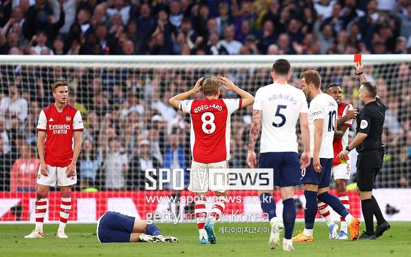 골 장면 직후 홀딩은 그라운드를 주저앉은 채 오른손으로 잔디를 내리쳤다. 분명 익숙한 장면이었다. 그에게 손흥민은 여전히 ‘넘지 못한 벽’이었다. 2021-22시즌 북런던 더비에서 이미 두 사람의 악연은 깊게 새겨져 있었다. 당시 아스널의 수비수였던 홀딩은 손흥민의 움직임을 막기 위해 거친 플레이를 반복했고, 전반 33분 손흥민의 돌파를 저지하려다 팔꿈치로 얼굴을 가격하며 경고 누적 퇴장을 당했다. 그 결과 아스널은 0-3으로 완패했고, 그 시즌 UEFA 챔피언스리그 진출권을 눈앞에서 놓쳤다.