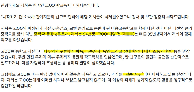 최근 한 온라인 커뮤니티에 ‘배우 고ㅇㅇ 학폭 피해자들입니다’라는 제목의 글이 게재되며 파장이 커지고 있습니다. 글 작성자들은 본인을 중리중학교 동창생이라 밝히며, 고민시가 학창시절 금품 갈취·폭언·장애 조롱 등 다수의 학생들에게 심각한 피해를 끼쳤다고 주장했습니다.