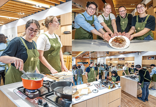 미국에서 교환학생으로 왔다는 올리비아 씨는 이번이 여섯 번째 참가라고 했습니다. 그는 “한국에 대해 공부하다 불교문화에 푹 빠져 사찰음식을 배우게 됐다”며 “사찰음식은 재료부터 낯설지만 외국인의 입맛에도 잘 맞는다. 이전에 만든 것 중엔 감자옹심이 수제비가 특히 맛있었다”고 말했습니다. 독일에서 온 엠마·다니엘 씨는 한국 여행 중 함께 이곳을 찾았습니다. 엠마 씨는 “비건(채식주의자)이라 사찰음식은 어떤 모습일지 궁금해 수업에 참가했다”고 말했습니다. 그러면서 “서양에선 채소 요리법이 발달하지 않았는데 다양한 식물성 재료로 맛을 내는 사찰음식은 완벽한 비건식단인 것 같다”고 전했습니다.