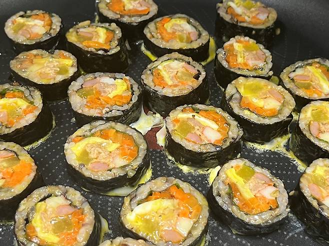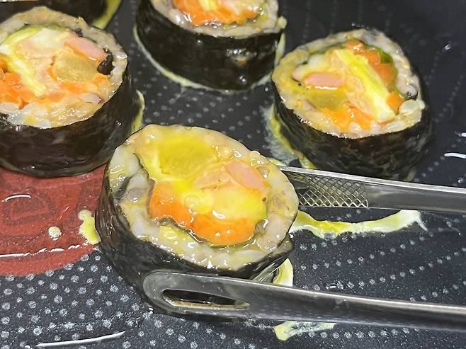 가장 많이 하는 방법이 계란물에 묻혀 프라이팬에 구워 먹는 방식인데요. 김밥 속까지 데우기에는 시간이 오래 걸리고 기름을 사용하다 보니 느끼할 수도 있습니다.
