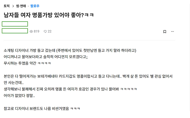 통념과는 달리 명품을 보유한 여성을 매력적이라고 인식하는 경우도 있다. 2024년 블라인드에 ‘남자들 여자 명품가방 있어야 좋아?’라는 제목의 글이 올라왔다. 소개팅 자리에 디자이너 가방을 들고 간 작성자는 “상대방이 가방 브랜드를 물으며 어디 제품인지 모르겠다”며 “약간 무시하는 투였다”고 설명했다.