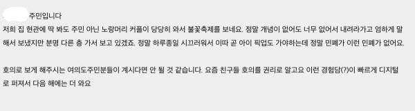 입주민 B씨는 “딱 봐도 아파트 주민이 아닌 커플이 당당히 와서 불꽃축제를 보길래, 내려가라고 내보냈다”며 “호의로 불꽃축제를 보게 해주는 주민 분이 계시면 안 될 것 같다”고 했다. 아파트 옥상 침입 시도도 있었다는 이야기도 나온다.