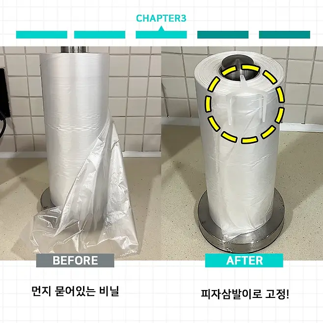 저는 또 다르게 말려있는 비닐이 사용하다보면 키친타올처럼 바닥에 축 늘어져 있더라고요. 그래서 이 또한 고정을 해봤는데 두꺼운 두께도 피자 삼발이로 고정하기에 좋았어요. 고정도 바로바로 되고 플라스틱으로 되있어서 사용하기도 너무 편했다니까요?ㅎㅎ