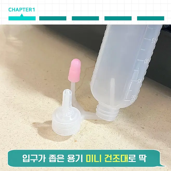 그 위에 약병을 걸어두면 정말 딱 맞게 건조할 수 있어요. 뚜껑과 입구, 병까지 사이즈가 안성맞춤이랍니다. good~ 약병 이외도 입구가 좁은 용기 건조하기엔 딱 이에요.