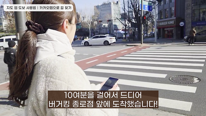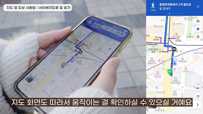 지도 앱의 도보 안내 기능을 이용하면 횡단보도를 건너거나 골목길을 지날 때도 실시간으로 경로를 확인할 수 있습니다. 화면 속 원의 움직임을 수시로 살피며 화살표 방향을 따라가면 됩니다. 더 자세한 방법은 유튜브 채널 ‘엄마아빠 정보독립시대’ 영상에서 확인할 수 있습니다.