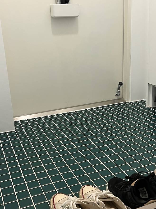외부와는 다르게 내부는 깔끔하고 관리가 쉽게 화이트 톤으로 통일했습니다. 현관 바닥은 초록색 미니 타일로 포인트를 주었고, 기존의 하얀색 신발장은 깔끔하게 관리가 잘 되어 있어 그래도 유지하였습니다!