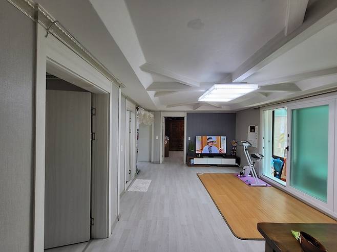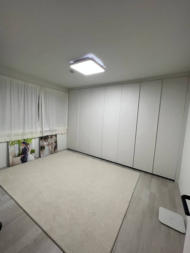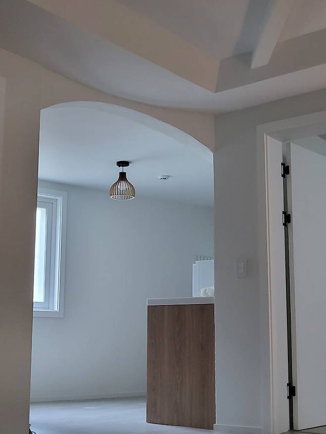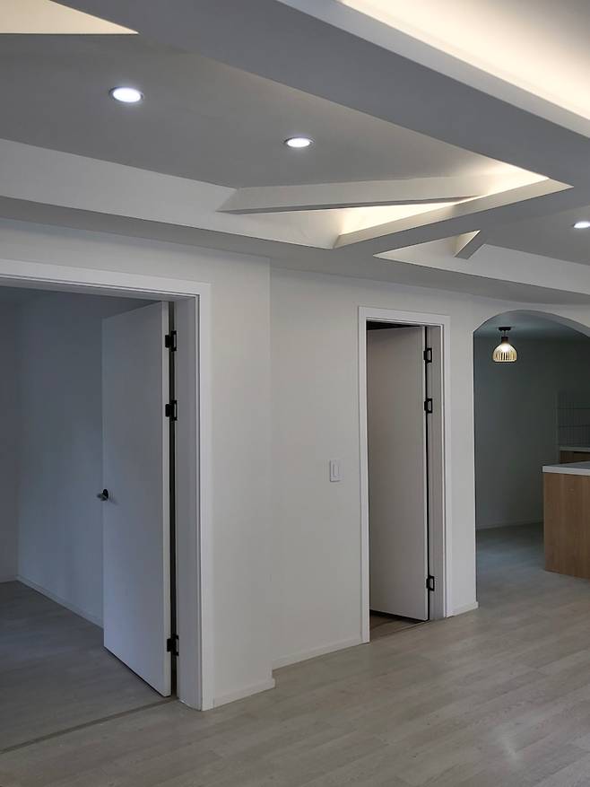 저희는 쨍한 형광등 조명을 선호하지 않아, 거실 천장에 전기 선을 더 설치해 간접 조명도 추가해주었어요.