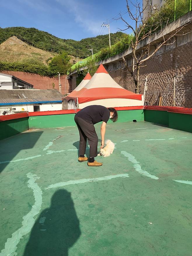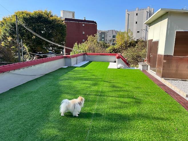 최근에는 옥상에 인조 잔디와 자갈, 나무 데크를 깔아 주어서 저희 강아지가 더 좋아하고 있어요 ㅎㅎ (옥상 창고에는 각종 캠핑 용품들을 보관하고 있어요. 최근에 또 캠핑의 매력에 빠져버려서..세상엔 재밌는 것들이 너무나 많네요..!)