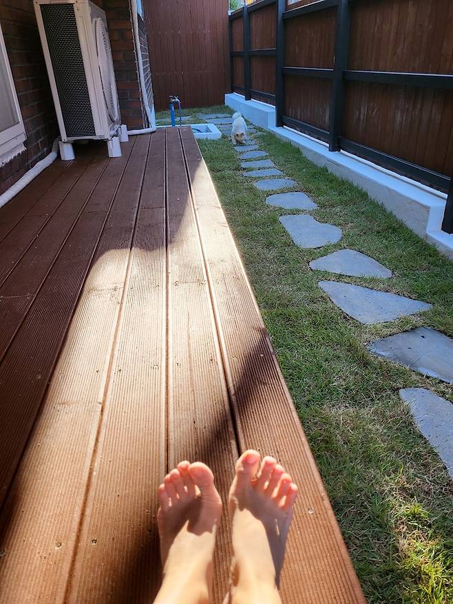 휴일에 마당 데크에 앉아서 강아지가 노는 모습을 지켜보면 그렇게 편안하고 행복할 수가 없어요. 이런 소소한 행복을 위해 마당 있는 집을 그렇게 찾아 헤맨 보람이 있는 것 같습니다!