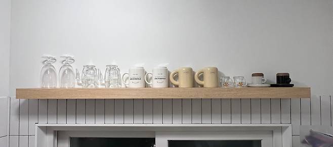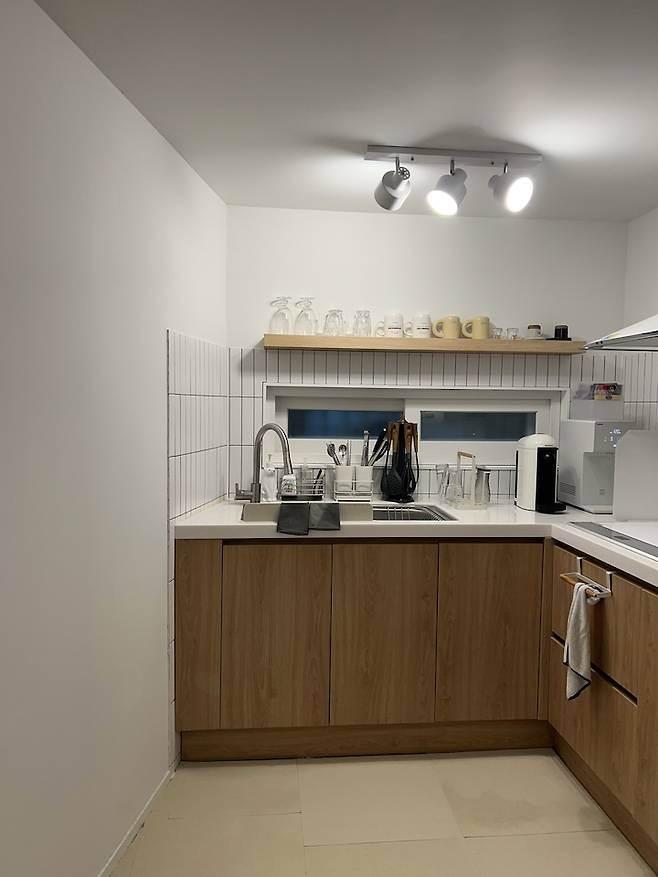 주방은 전체적으로 깔끔한 화이트&우드 톤으로 선반과 하부장을 통일하였고, 레일 조명과 인테리어 조명을 설치하였습니다. 상부장 대신, 선반을 달아서 잔들 위주로 놓으니 분위기도 좋고 수납도 부족하지 않더라구요.