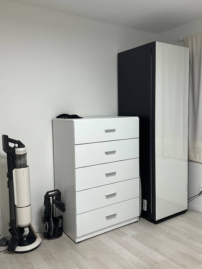 붙박이 반대편에는 동일한 톤의 화이트 5단 서랍장과 삼성 스타일러를 두었습니다. 바닥에는 러그를 깔아서 따뜻한 분위기를 조성했습니다.