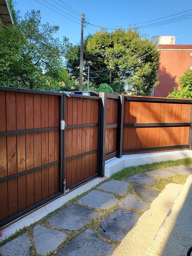 기존 돌 담벼락도 사실 좋았지만 구멍이 나서 무너져 내려가고 있었어요. 그래서 아쉽지만 철거 진행 후, 어느 정도 프라이버시를 보호할 수 있는 높이지만 개방감도 느껴지는 나무 담벼락으로 교체하였습니다. 마당에 있는 나무 데크와 통일감을 주기 위함도 있었어요.