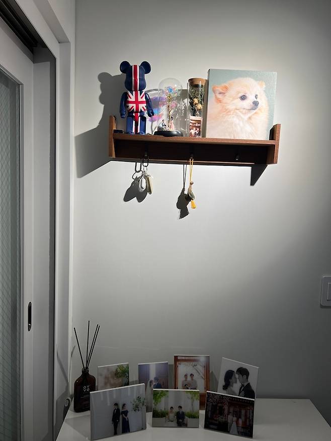 중문 바로 앞에는 외출 전/후로 자주 사용하는 차 키, 마스크 등을 행잉할 수 있는 벽 선반과 수납장을 두어 자주 사용하는 용품들을 수납하고 사진 등을 진열할 수 있는 작은 전시 공간을 만들었습니다. 또한 각도를 조절할 수 있는 조명을 통해 포인트를 주었습니다!