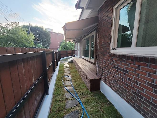 정원에 물을 주거나 청소하기에 좋더라구요 ㅎㅎ 나무 데크 위에는 햇빛을 가리거나 데크가 비에 젖지 않도록 해주기 위해 접이식 어닝을 설치해두었습니다.
