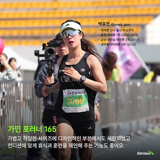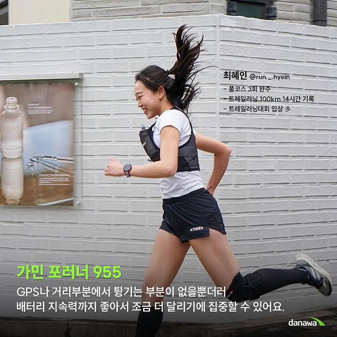 A : 로드용은 가민에서 새로 출시한 포러너 165. 장거리용은 가민 포러너 955를 착용해요.