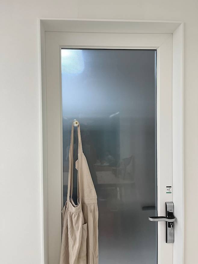 주방에서 세탁실로 나가는 문은 단열을 위해 터닝도어로 교체했어요. 앞치마를 걸어둔 고리는 그립톡이에요. 사용 안 하는 그립톡을 요렇게 활용하니 좋고, 볼 때마다 귀여워요.