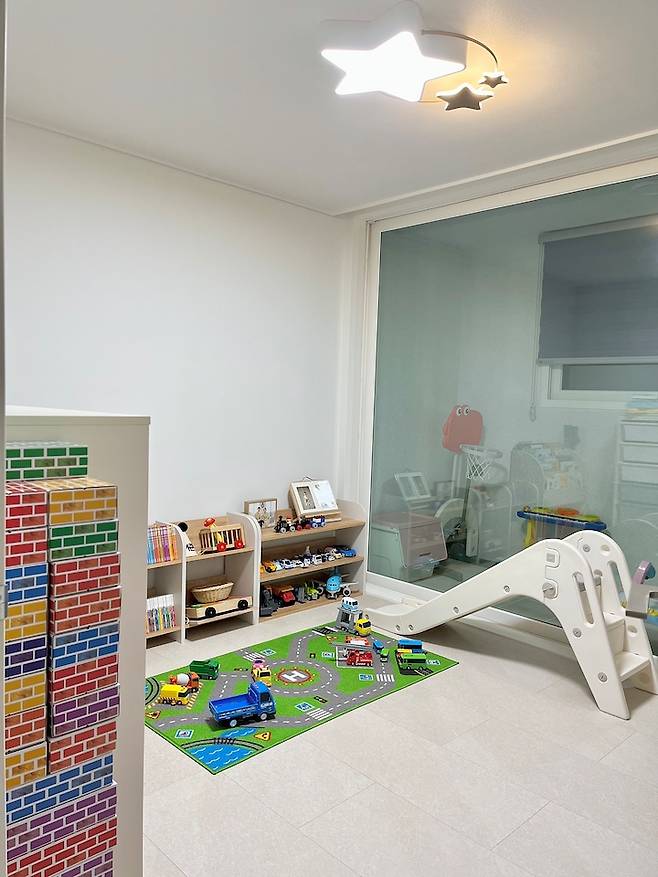 귀여운 포인트 조명이 있는 4살 아이의 놀이방이에요. 이사 후 한동안 자기 방에 별이 있다며 아이가 만나는 사람마다 자랑했던 기억이 나네요. 좋아하는 빠방이(자동차)를 진열해 둘 수 있게 교구장을 두니 아이와 정리도 놀이처럼 한결 수월해졌어요.