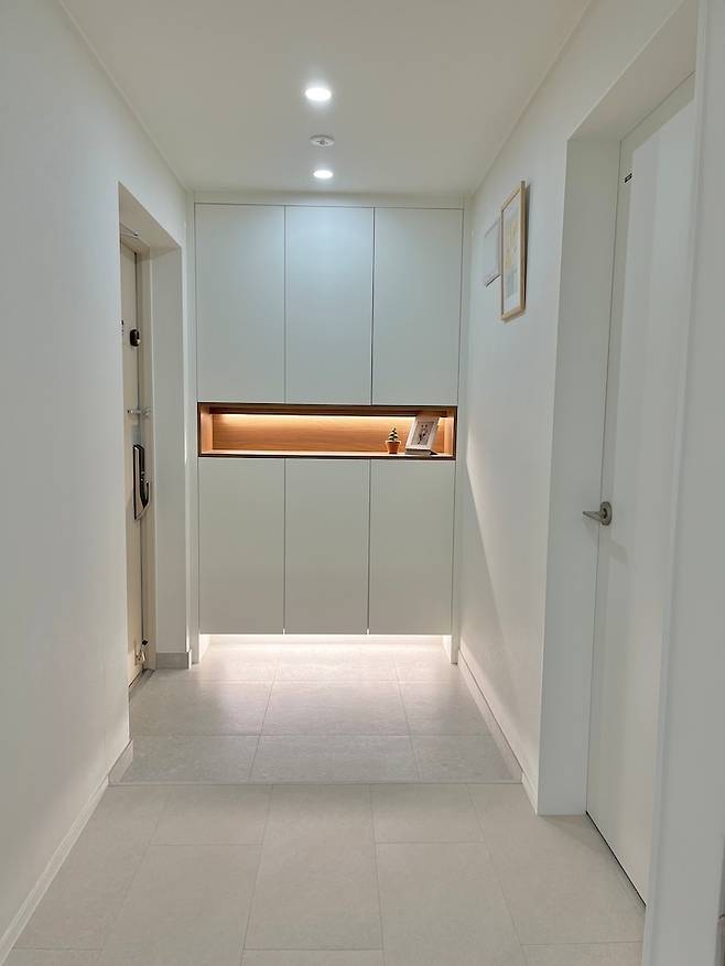 우리 집에는 우드 포인트 공간이 총 3곳 있는데 그 중 첫 번째 공간입니다. 신발장 중간에 우드 오픈 선반은 인테리어 효과도 크고, 외출 시에 필요한 마스크, 차키 등 간단한 물건을 올려두기에 참 실용적인 공간이에요. 신발장은 하단 띄움으로 자주 신는 신발을 편하게 보관할 수 있도록 했어요.