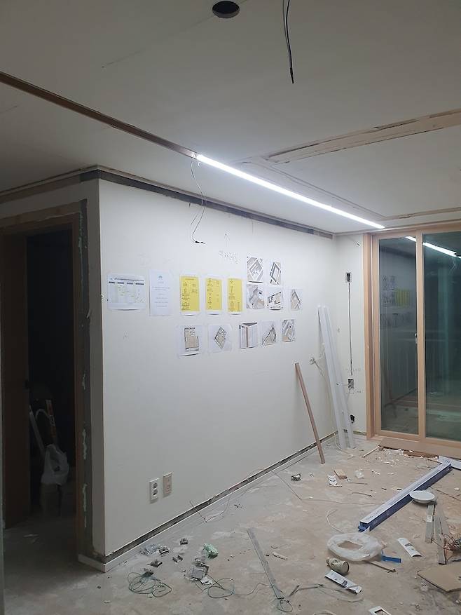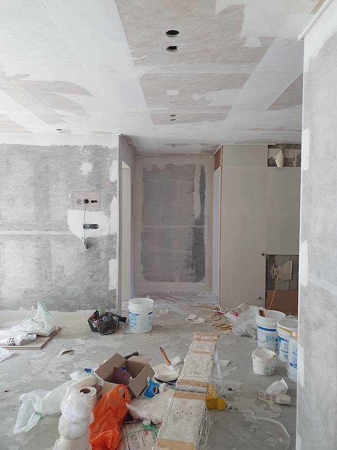 공사 막바지 도배공정 초배 중인 사진이에요. 우리 집 공정은 철거→목공→전기→화장실 설비 및 방수→필름→폴딩도어→타일→도배→마루→가구→입주 청소→실리콘 마감 순서로 4주간 진행했어요.