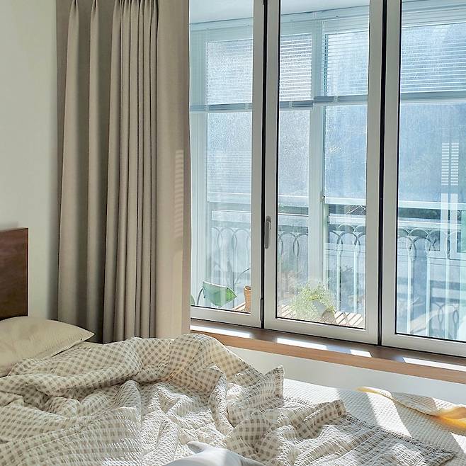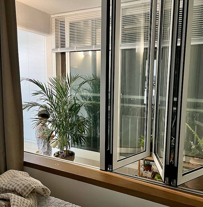 저의 힐링 포인트 초록 아지트가 보이는 침실입니다. 눈 뜨자마자 싱그러운 식물 친구들을 볼 수 있어요. 주말 아침에 일어나 잠 깨며 한참을 식멍 하곤 해요. 침실은 확장하지 않고 폴딩도어를 시공했어요.