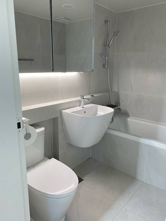 욕실 타일은 600*600 크기로 메지라인을 최소화해서 물때 관리가 편하도록, 세면대와 변기도 직선 라인의 원바디 형태로 골랐어요. 바닥과 변기를 이어주는 부분이 간결해서 무엇보다 유지 측면에서 관리가 쉽게 했어요.