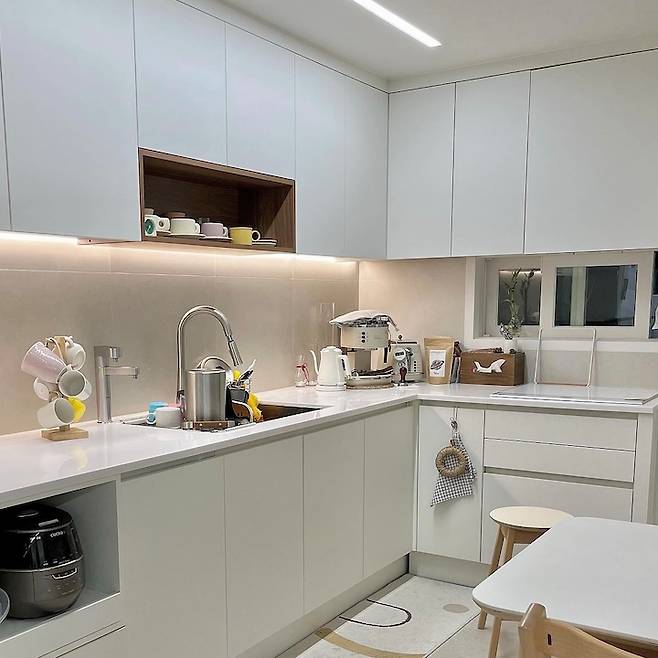 그 덕분에 빌트인 3종 인덕션, 식기세척기, 정수기까지 각자 자리를 찾아 넣어 작지만 알차게 깔끔하고 단정한 주방으로 변신했어요.