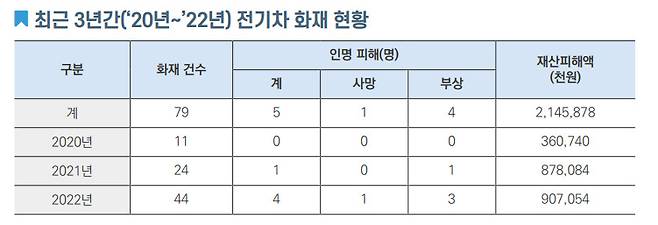 전기차 화재는 2017년 1건, 2018년 2건, 2020년 11건, 2021년 24건, 2022년 44건, 화재로 인한 인명피해는 사망 1명, 부상 4명, 재산 피해는 2020년 3억6천만 원, 2021년 8억7,800만 원, 2022년 9억700만 원으로 집계돼 있다.