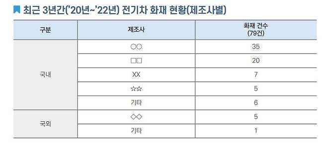 이에 따르면 최근 3년간 국내에서 발생산 전기차 화재 건수는 총 97건이었으며 제조사별로는 ○○사가 35건, □□사가 20건, ××사는 7건' ☆☆사는 5건, 기타 6건, 해외 차량은 ◇◇사가 5건, 기타가 1건이었다.