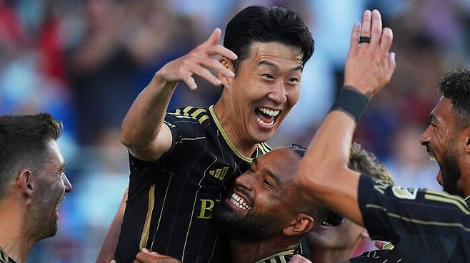 ▲ 손흥민이 MLS 축구 경기 1차전에서 데뷔골을 넣은 후 팀 동료들과 함께 축하하고 있다.