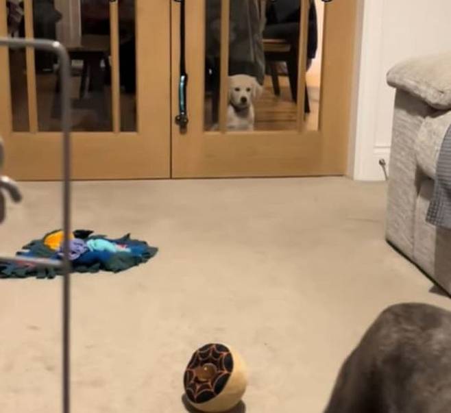 결국 주인은 잠시 형에게 쉴 시간을 주기 위해 아기 골든 리트리버 강아지 랄프를 방 밖으로 내보내기로 합니다.