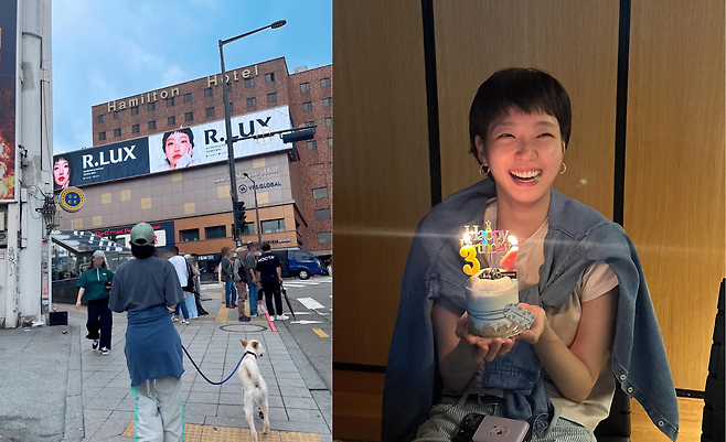 생일 케이크를 든 모습에서는 데님 재킷을 활용한 캐주얼 스타일링을 보여주고 있다. 오버사이즈 데님 재킷과 베이직한 이너웨어의 조합으로 편안하면서도 스타일리시한 룩을 연출하고 있다. 짧은 헤어 스타일과 자연스러운 미소가 친근한 매력을 더하고 있다.