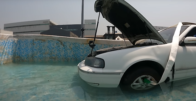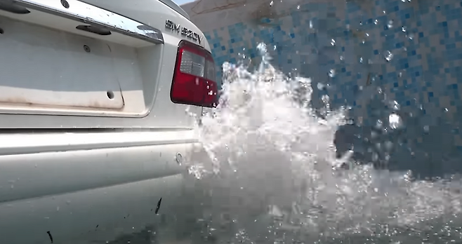 침수의 단계 중에서 가장 낮은 수준이라고도 볼 수 있는 머플러가 다 잠기는 정도로 물을 채워놓고 어떻게 증상이 발생되는지를 우선적으로 살펴보았을 때, 우려와는 다르게 시동이 꺼지지 않는 모습을 볼 수 있었습니다.