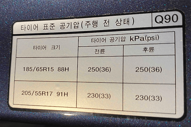 따라서 미리 타이어 공기압을 적정하게 맞춰주세요. 타이어 적정 공기압은 보통 운전석 문을 열었을 때 차체에 붙여진 스티커에서 확인할 수 있어요. 다른 정비를 위해 정비소 방문시 서비스로 타이어 공기압을 채워주시기도 해요.