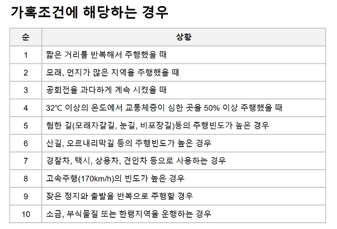 또한 내가 아래 주행환경에 해당하면, 가혹조건에 해당되어 엔진오일 수명이 짧아지기 때문에 조금 더 일찍 교체하는 걸 제조사에서도 권장하고 있습니다. (7,500km마다 / 6개월 마다 교체)