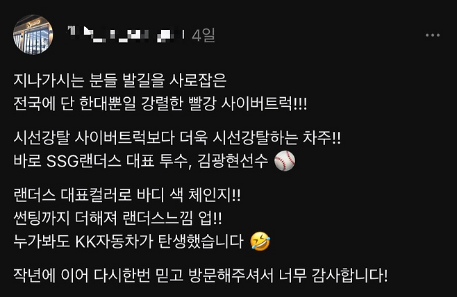 해당 차량은 빨간색 랩핑을 통해 기존 사이버트럭과는 전혀 다른 인상을 준다. 직선 위주의 미래적인 차체 디자인에 대담한 색상이 더해지며 독보적인 존재감을 드러낸다. 국내에서 보기 드문 사이버트럭 자체의 희소성에 이례적인 컬러 조합까지 더해지면서 단숨에 화제의 중심에 섰다. 빨간색은 김광현의 소속팀인 ‘SSG 랜더스’의 상징 컬러이기도 하다.
