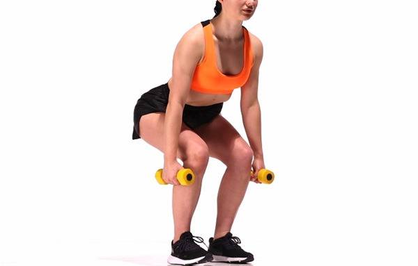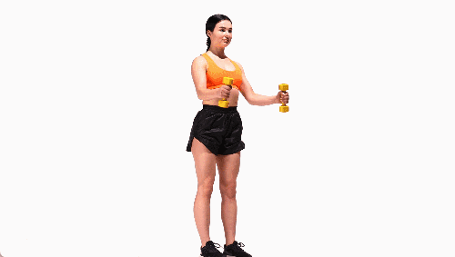 바닥에 서서 손에 아령이나 물병을 들고 시작합니다. 팔꿈치는 몸 옆에 고정한 채 팔만 구부려 아령을 어깨 쪽으로 들어 올린 후 내립니다. 이어서 팔을 뻗은 상태로 유지하면서 무릎을 구부리고 엉덩이를 뒤로 빼며 스쿼트 자세를 취한 후 다시 일어납니다.
